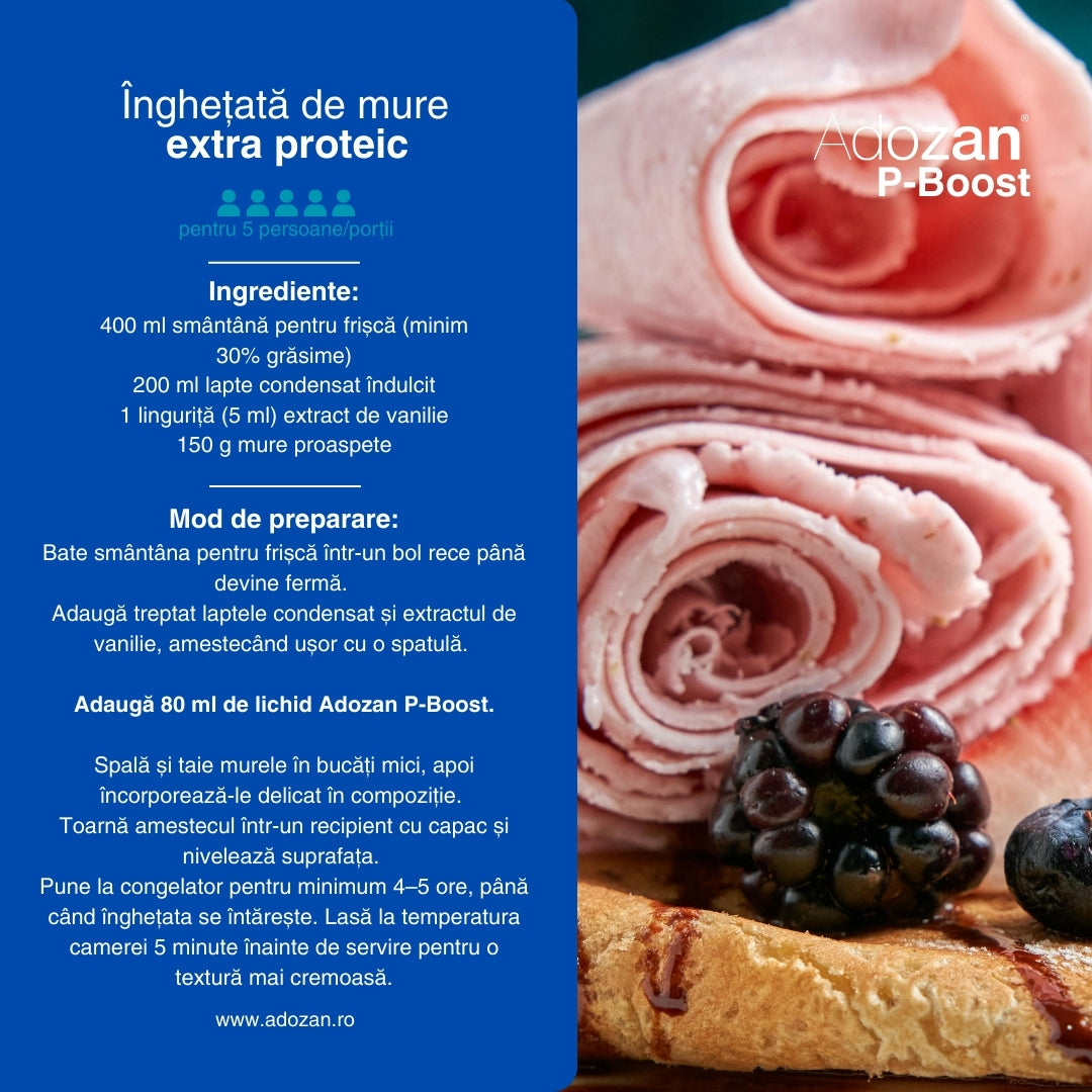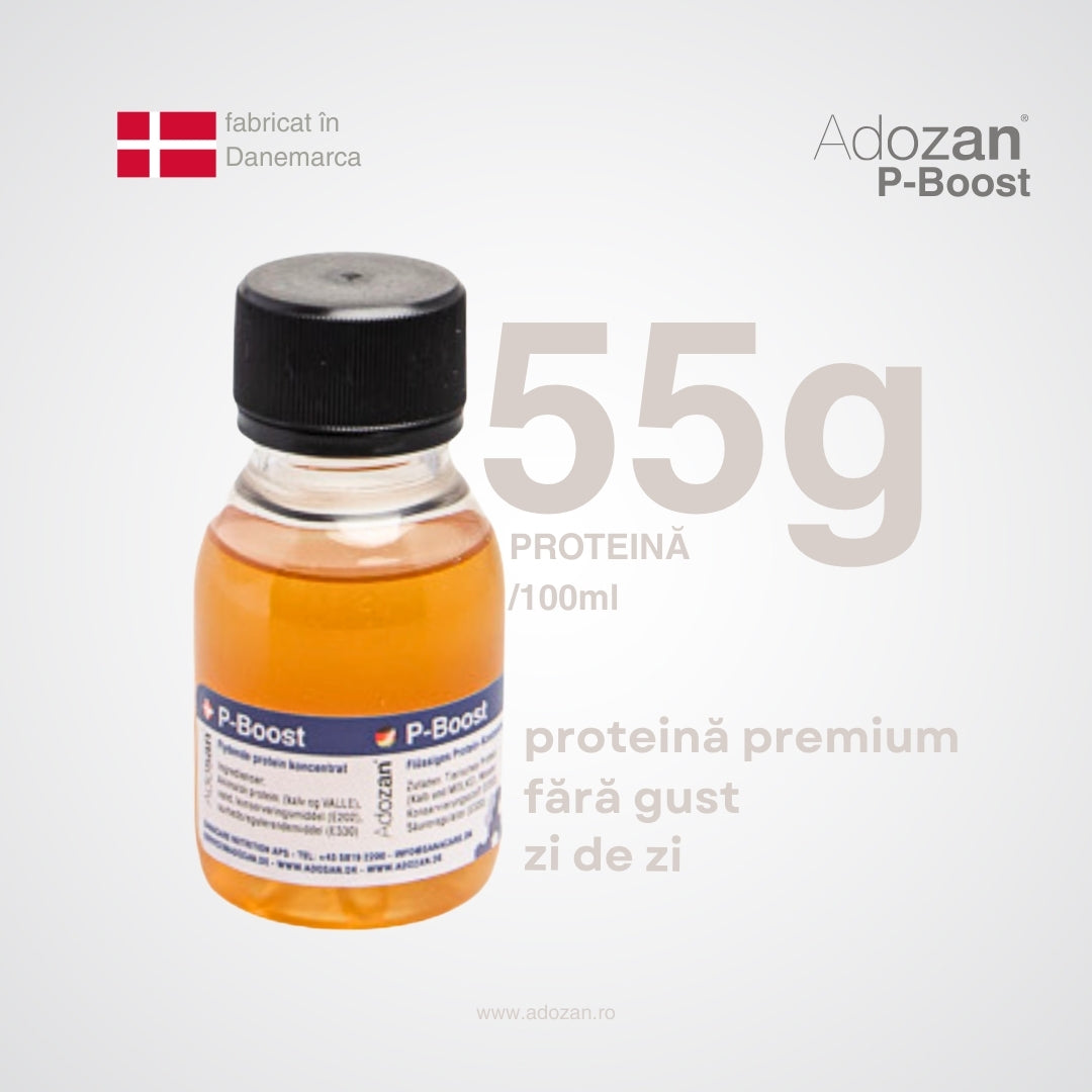 Adozan P-Boost este "asul din mânecă" pentru momentele în care ai nevoie de un aport masiv de proteine, dar nu ai timp să prepari shake-uri sau nu ai poftă de mâncare. Este un supliment lichid, gata de utilizare, care concentrează puterea unei mese proteice într-un volum de doar 50 ml.