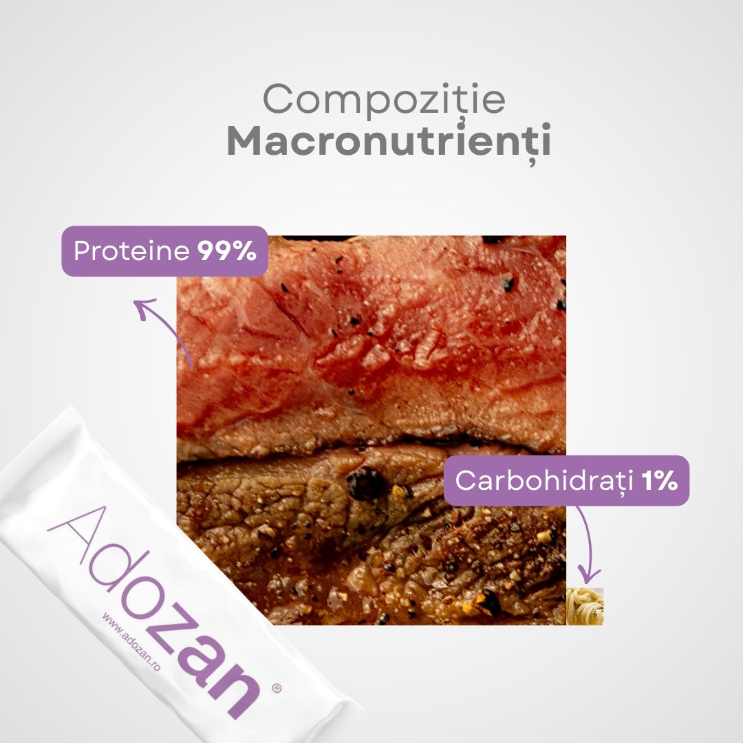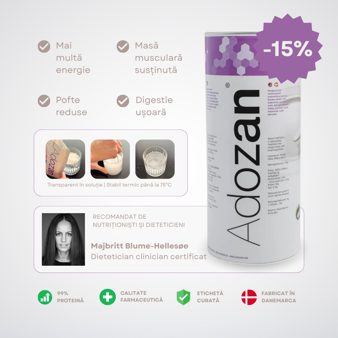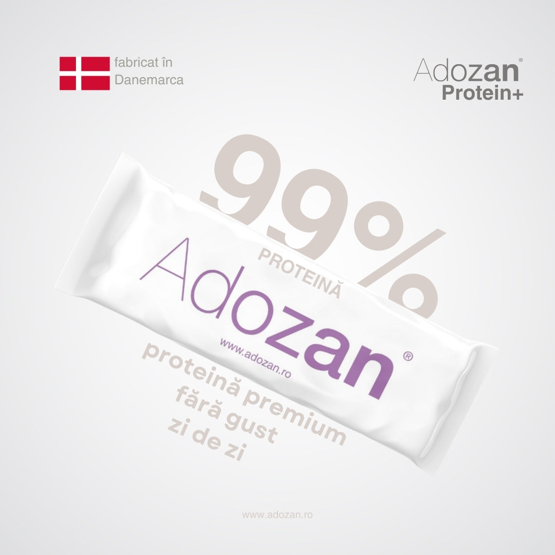 - Rafală Total Neutru: Spre deosebire de pudrele clasice, Adozan Protein+ nu are aroma. Îl poți fi cu apă simplă, poți pune în cafeaua de dimineață, în sucuri naturale sau chiar în supe și piureuri calde.